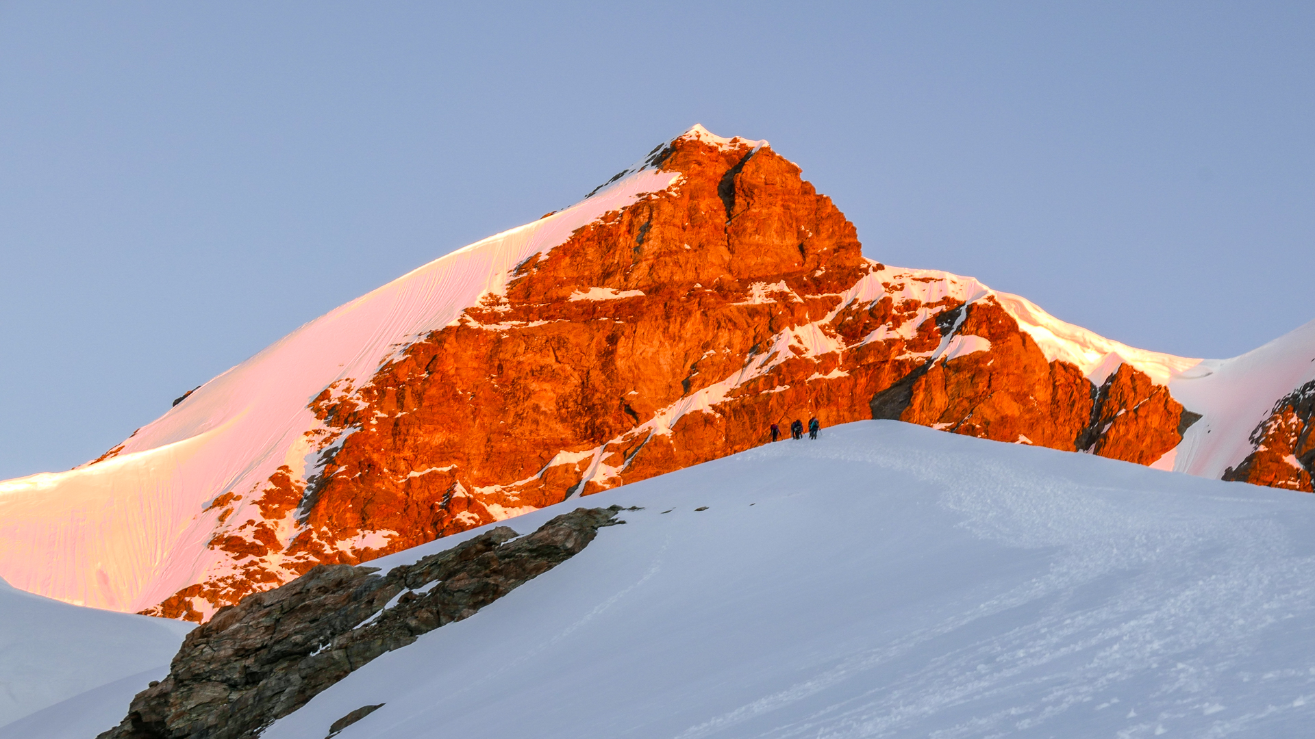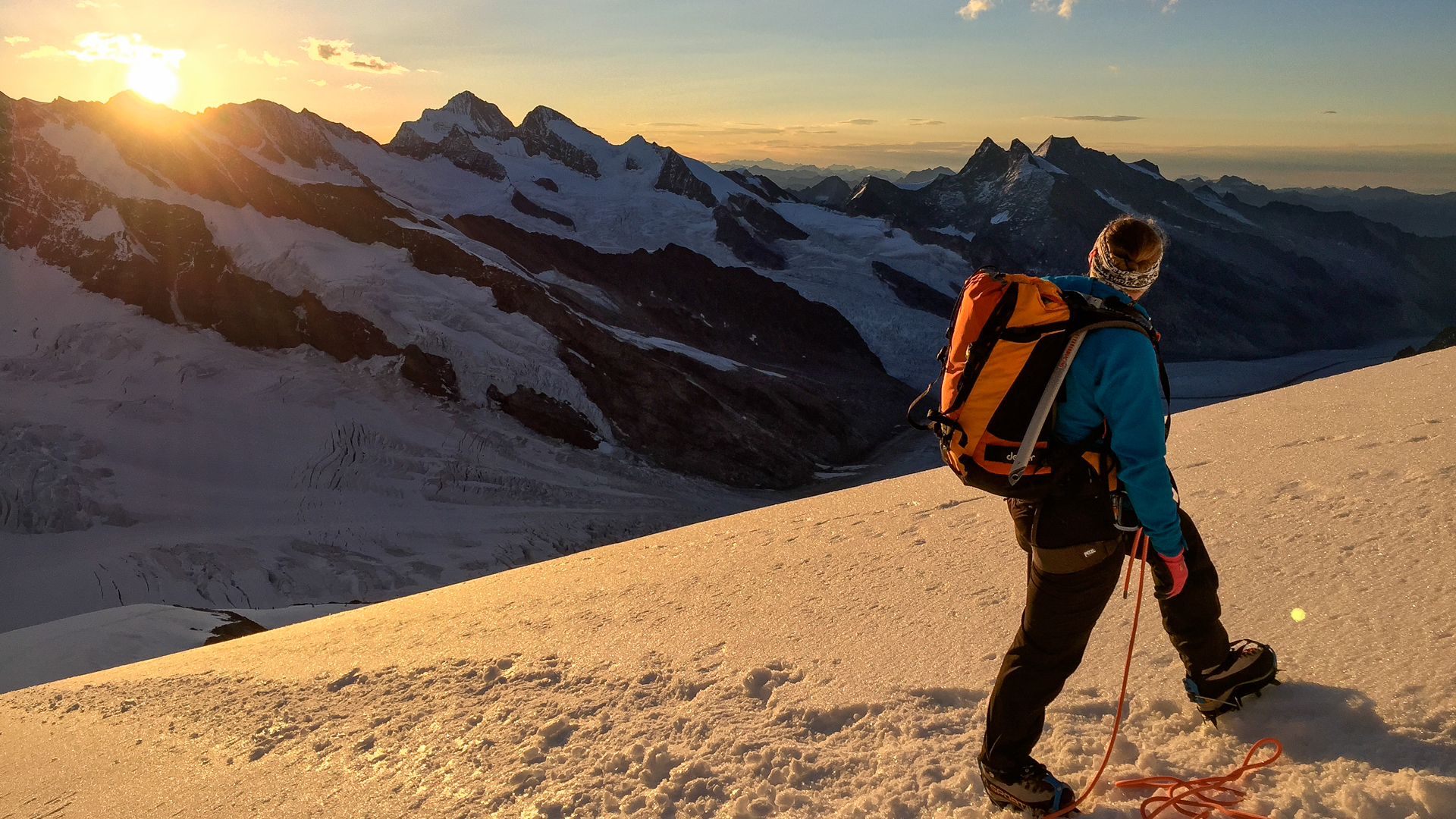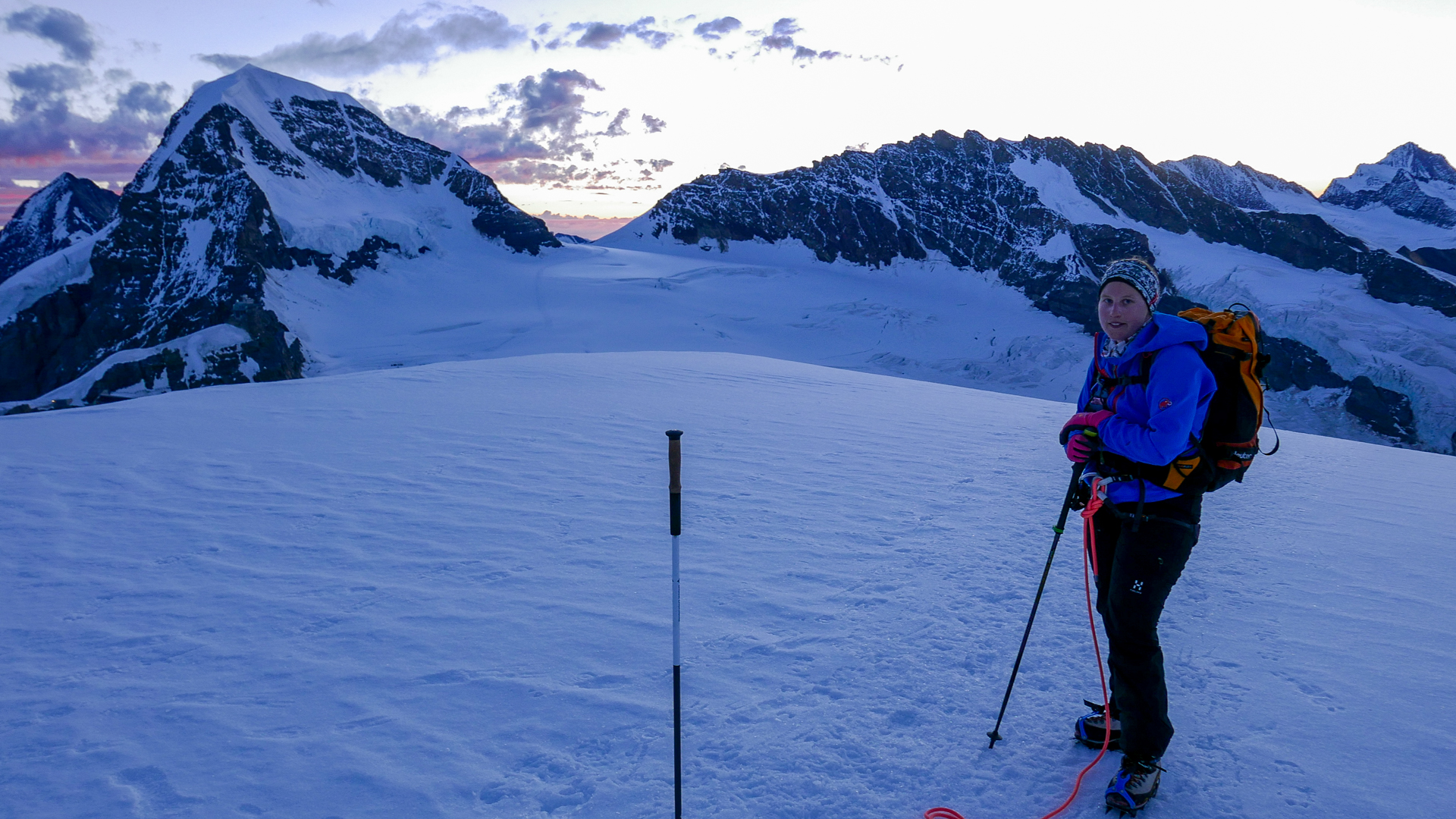 Am ersten Tourentag steht die Besteigung des Mönchs auf dem Programm – ideal zur Akklimatisation und als Einstieg in die hochalpine Umgebung. Über Firnfelder, in leichter Kletterei und über einen serh luftigen Gipfelgrat erreichst du den aussichtsreichen Gipfel mit Blick auf Eiger, Jungfrau und das endlose Eismeer.