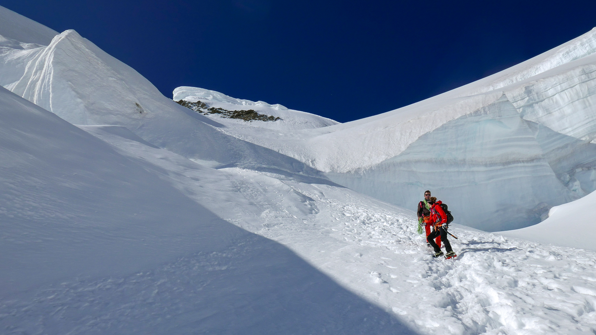 Exzellente Kondition für Aufstiege bis 5 Stunden, Hochtourenerfahrung, sicheres Steigeisengehen, Klettererfahrung im 2. Schwierigkeitsgrad.