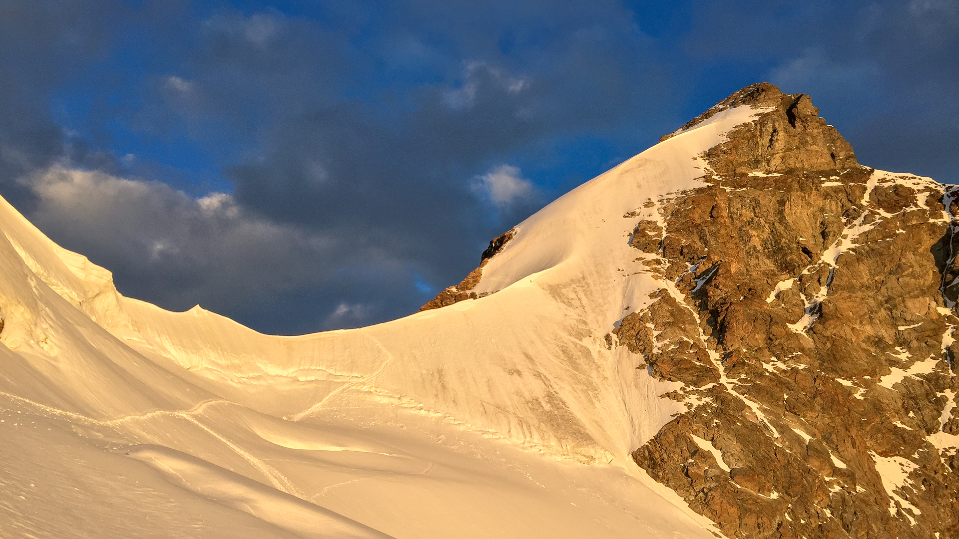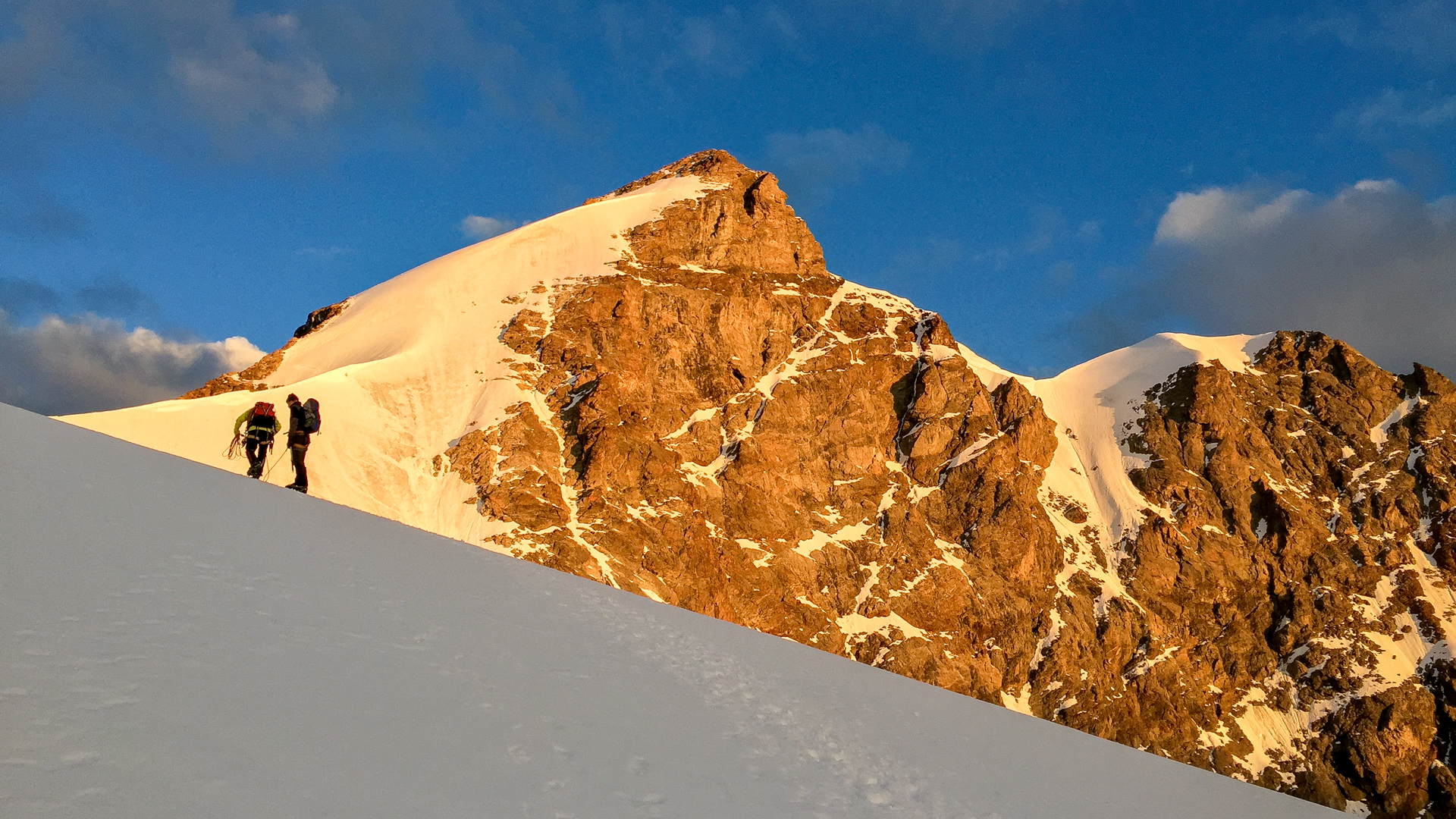 Nach Sonnenaufgang brechen wir am nächsten Morgen auf den Weg zum Piz Palü auf, unter einem rotgolden leuchtenden Piz Bernina vor strahlend blauem Himmel. Auch heute bleibt die Sonne unser Begleiter auf dieser wunderbaren Tour. Die Überscheitung des Piz Palü lässt die Herzen höher schlagen. Gestern haben wir seine Schönheit von unten bewundert, und jetzt queren wir ihn auf atemberaubendem Grat. Auf den drei Gipfeln bleibt Zeit, die überwältigende Aussicht zu genießen, die Spuren unserer Tour vom Vortag zu bewundern und unzählige neue Hochtourenziele für das nächste Jahr zu entdecken. Zurück auf der Diavolezza der Blick zurück – die Gipfel des Piz Palü haben sich wieder in Wolken gehüllt.
