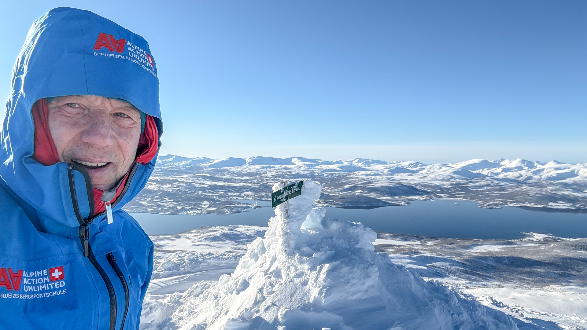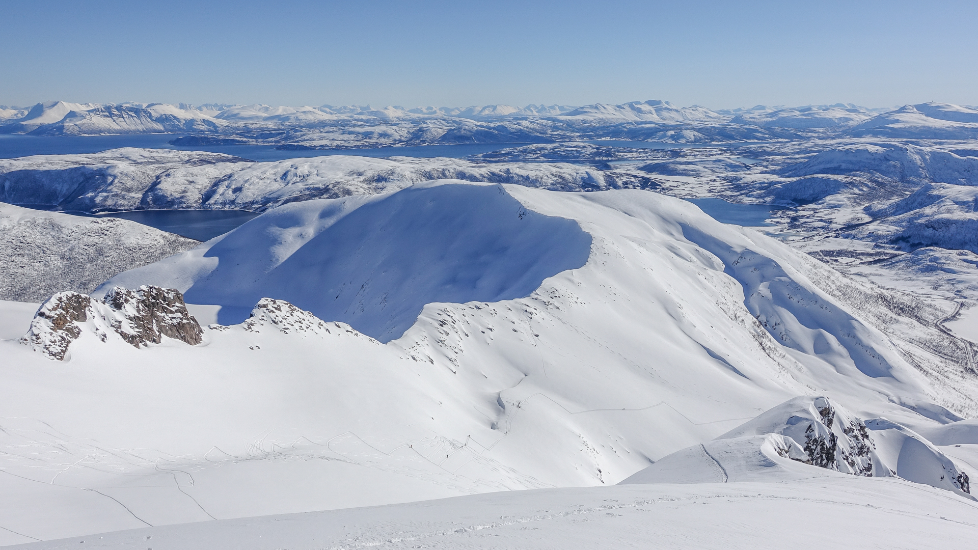8. Tag: Vom Kaperdalen aus bestiegen wir den Tredje Svanfjellet, 898 m. Dieser lässt sich mit dem Førstefjellet, 807 m, zu einem tollen Tourentag kombinieren. Traumhafte Abfahrten über weite, offene Hänge.