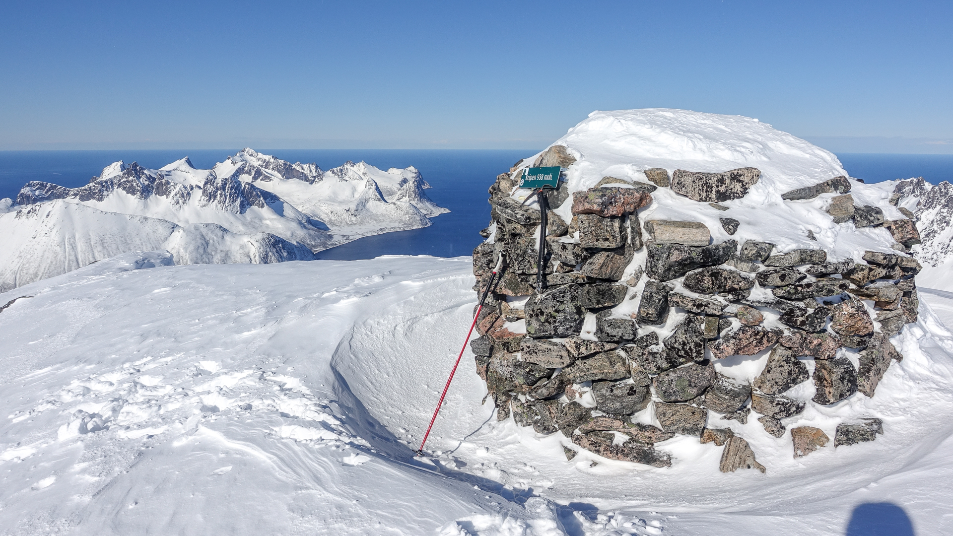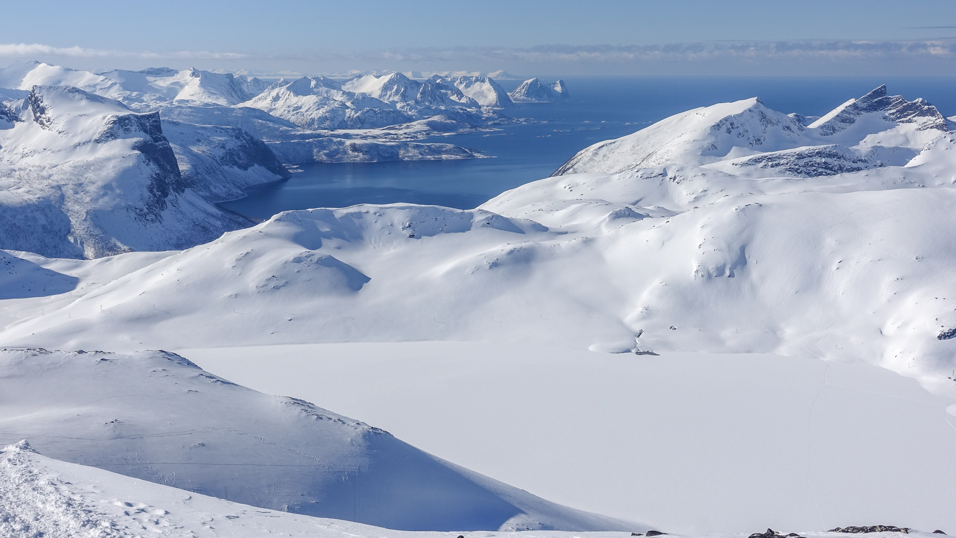 5. Tag: Im Westen von Senja besuchen wir den höchsten Skitourengipfel Senjas, den Kvænan, 963 m. Die unglaublich faszinierende Aussicht wird uns begeistern. Auf dem Rückweg können wir noch dem Istind, 851 m, oder dem Kaperfjellet, 850 m, einen Besuch abstatten.