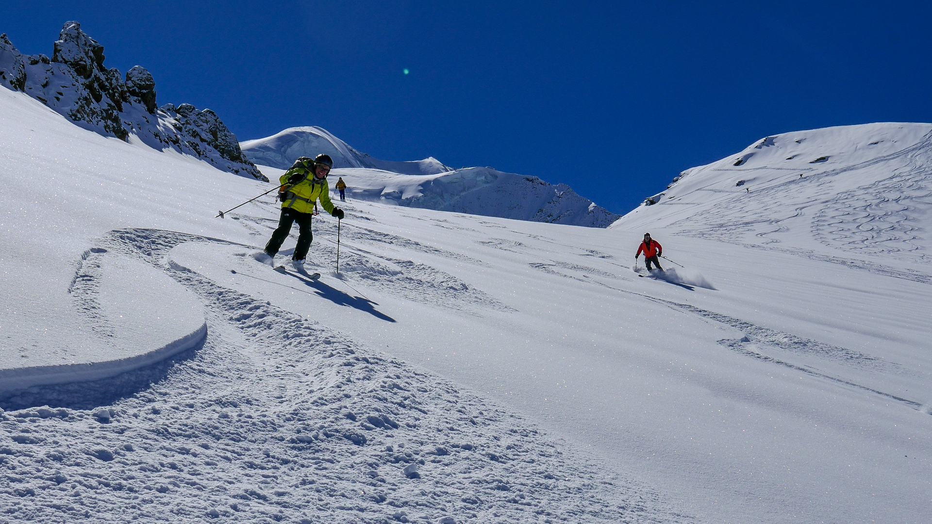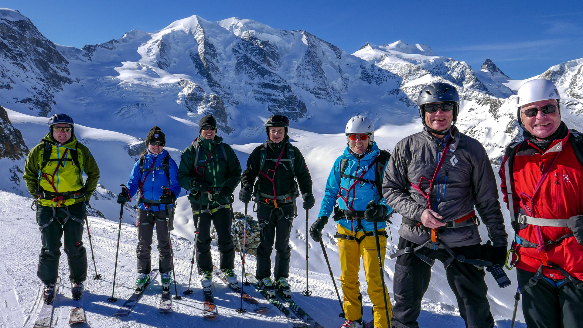 4. Tag: Abfahrt von der Diavolezza auf den Vadret Pers und Aufstieg in traumhafter Kulisse auf die Gemsfreiheit, 3186 m. Hier stehen wir im Herzen des sogenannten Festsaales der Alpen! Abfahrt über 1300 Höhenmeter über den Vadret da la Fortezza und den Vadret da Morteratsch nach Morteratsch.